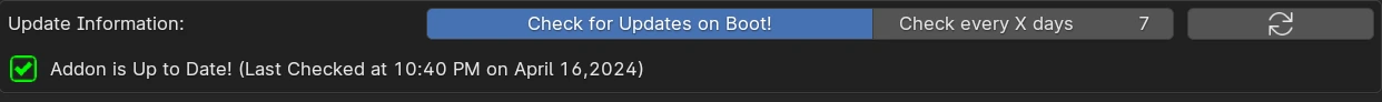 This section indicates when there's an available update for the addon. By default, it checks for updates on boot every 7 days. You can adjust this frequency to stay up-to-date at all times. Additionally, you can manually check for updates by clicking the refresh button.